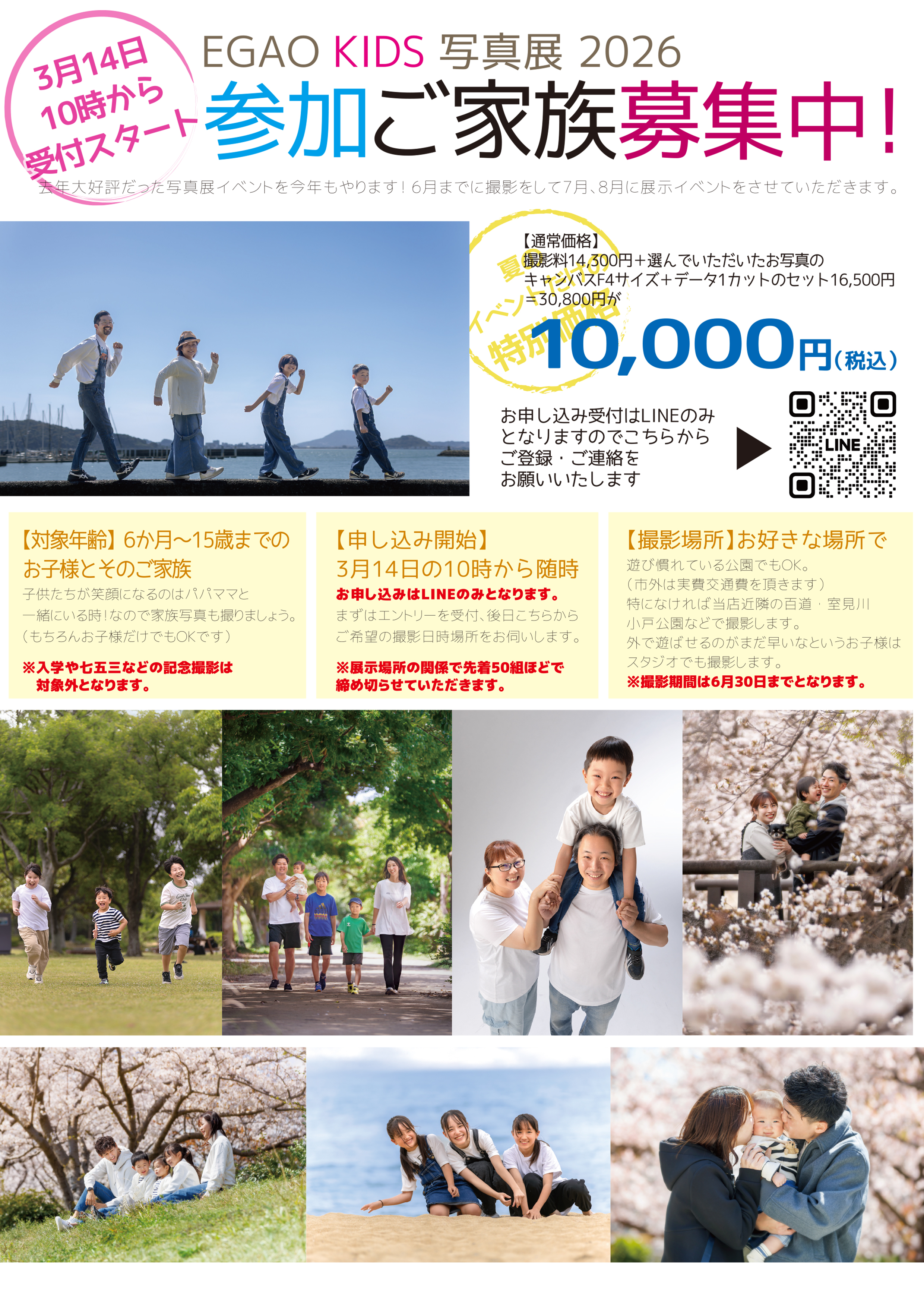 今年も夏のイベント「EGAO KIDS写真展2026」を8月2日に開催したいと思っています。 そこで写真展に参加いただけるお子様・ご家族を募集いたします。(今年はペットのみの参加は不可となっております)